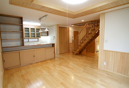 リビング: リビングの様子です。 天井は掘り込み天井になっており、リビング全体がより広い印象に。 その周りには檜(桧)を使用し、風情のある仕上がりになっています。 大工の技が生かされた、落ち着く空間です。 また、写真左には棚や戸棚を設けて収納力も向上させました。
