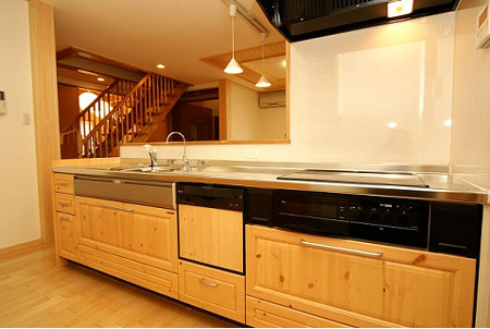 キッチン:キッチンは対面式のキッチンになっています。料理をしている間も会話が弾みそうですね。扉柄も木に合わせているため、リビングにマッチした統一感のある仕上がりに。キッチンスペースは広く設けたので、作業しやすくなっています。