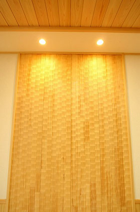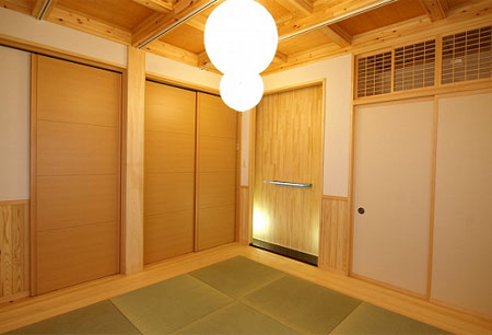 和室:8畳のスペースを設けた和室です。お部屋の周りには檜(桧)の床を使用しアクセントに。3尺角の畳を使用したことで和室がモダンな印象になりました。腰壁には杉、その上は珪藻土で仕上げました。間接照明で空間を表現しています。