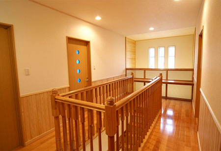 2階 ホール: 奥が玄関の吹き抜けになっているため、2階にも光を取り込むことが出来るようになりました。 そのため、奥は家族共通のスタディースペースになっています。 落下を防止するスタディースペースの正面のアイアンには、パンチングメタルを木と組み合わせました。