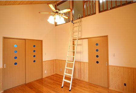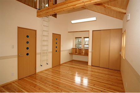 子ども部屋:ロフトから見下ろした子供部屋です。主寝室と子供部屋の天井は勾配天井になっているため広く感じられます。また、天井部分には檜(桧)を貼っています。