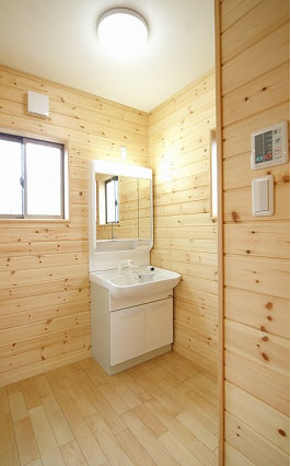 洗面・脱衣室:洗面・脱衣室です。壁にはパイン材を使用し、独特の自然の風合いを感じることが出来る空間になりました。まるで自然に包まれているように感じますね。