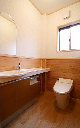 トイレ:トイレの様子です。木を使用し、落ち着いた印象の弊社仕上げのトイレです。トイレはタンクレスタイプのものを使用しているので、お掃除も楽にできますよ